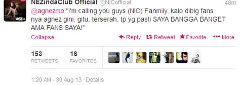"I'm calling you guys (NIC) Fanmily, kalo dibilangg fansnya agnes gini, gitu, terserah. Tapi yang pasti saya bangga banget sama fans saya!" ujar Agnes disadur dari Twitter NICofficial.