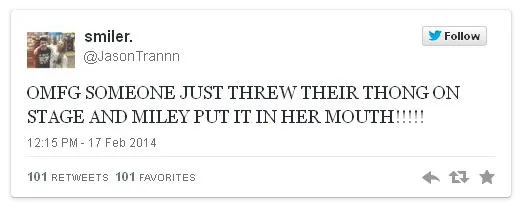 Semua penonton terperangah melihat kejadian ini dan lini masa pun banjir dengan kabar Miley memakan thong. Adegan vulgar ini pun difoto oleh seorang fans, saat Miley membungkus micnya dengan thong dan kemudian menaruhnya di bibir.