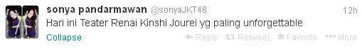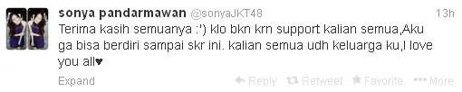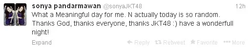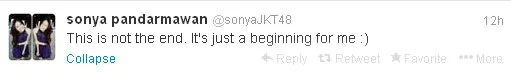 Di akun twitternya Sonya yang biasa dijuluki Miss Hungry ini mengucapkan terima kasih sekaligus permintaan maaf untuk para penggemarnya. Baginya selama di JKT48 adalah pengalaman yang paling berharga.