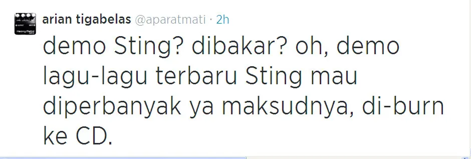 Lantas saja, Tweet dari Arian ini membuat pengguna Twitter tersenyum. Demo Sting yang berlangsung tadi siang dijaga ketat oleh pihak kepolisian dan sempat menyebabkan kemacetan. Tak heran pengguna jalan sempat menyayangkan hal tersebut.