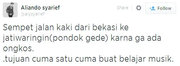 Kapanlagi.com - Meski kini berkiprah di dunia akting, namun musik adalah hasrat utama yang disukai oleh Aliando Syarief. Remaja tampan ini mengenang perjuangannya untuk bisa bermain musik melalui akun twitternya