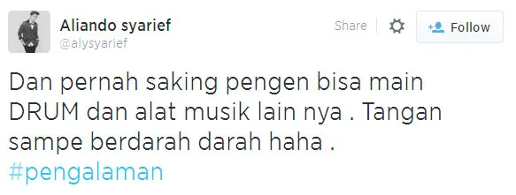 Tekad untuk menguasai semua alat musik pun tak terbendung lagi. Seperti saat belajar main drum, tangan Aliando sampai terluka. Namun karena hasratnya ada di situ dia tak menghiraukannya.