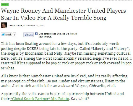 "Holy sh*t. The worst MU-song ever, really. I aplogoize - instead of this Nidji-guy - to everybody hear this terrible song. Shame of the history of such a big club," tulis Szabolcs Vincze di kolom komentar Youtube.