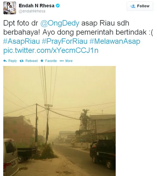 Kondisi di Riau saat ini sungguh sangat memprihatinkan di mana kota menjadi kuning akibat asap. Tak terbayangkan jika udara seperti itu dihirup terus menerus. Semoga pemerintah segera mengatasi dan tidak menunggu jatuh korban dahulu baru bertindak.