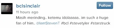 Setelah bikin iri karena bisa menonton konser Beyonce secara langsung, kini BCLÂ membuat iri lagi karena bisa bertemu dengan vokalis Aerosmith, Steve Tyler. Dalam foto yang diunggah di akun instagramnya @bclsinclair vokalis gaek tersebut merangkul dan menciumnya.