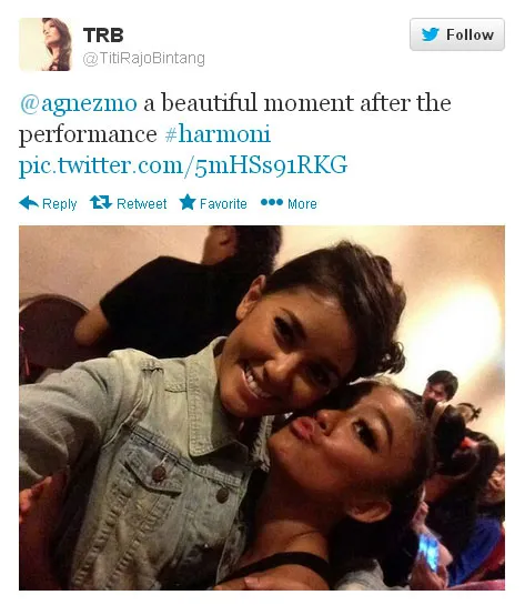 Titi juga mempostingkan foto dirinya bersama Agnes setelah tampil di akun twitternya.