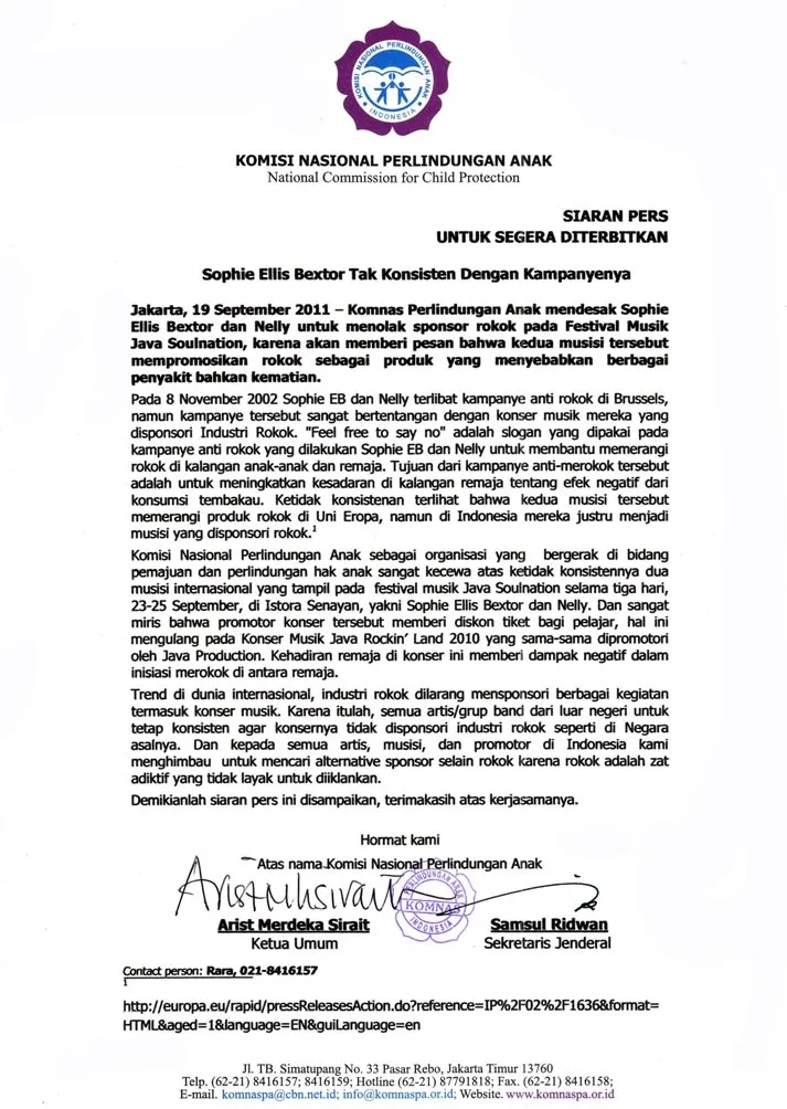 Kapanlagi.com - Di tengah meriahnya penyambutan konser Java Soulnation 2011, Komisi Nasional Perlindungan Anak justru memiliki pendapat tersendiri. Komnas Perlindungan Anak secara tegas mendesak agar dua artis dari acara tersebut yakni Sophie Ellis-Bextor dan Nelly untuk menolak sponsor rokok yang menjadi sponsor utama acara yang digelar 23-25 September 2011 mendatang.
