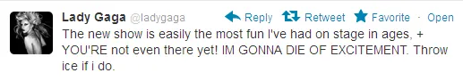 "The new show is easily the most fun I've had on stage in ages, + YOU'RE not even there yet! IM GONNA DIE OF EXCITEMENT. Throw ice if i do," tulis GaGa di akun Twitternya, @ladygaga, pada Minggu (11/3) kemarin.