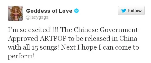 Persetujuan Menteri Kebudayaan Cina akan album ini tentu saja menjadi kabar bagus bagi Gaga. Rasa syukur ini ia ungkapkan melalui twitter sekaligus berharap suatu saat nanti bisa menggelar konser di sana.