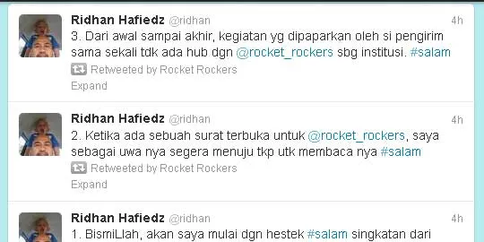 "Dari awal sampai akhir, kegiatan yang dipaparkan oleh si pengirim sama sekali tidak ada hubungan dengan @rocket_rockers sebagai institusi," tulisnya di twitter.