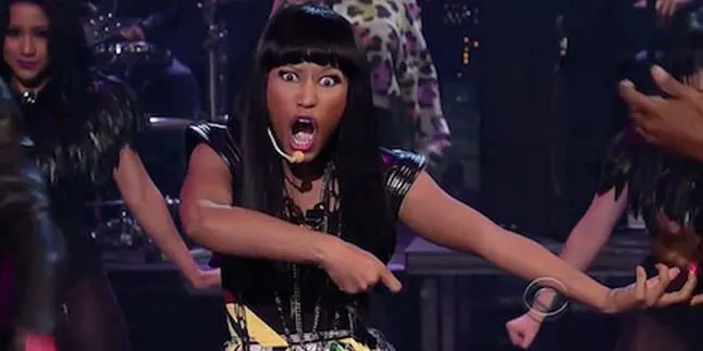 Bukannya menebar senyum, Nicki Minaj seolah menakut-nakuti para penonton dengan ekspresi konyolnya di foto ini. Kami ragu mereka merasa terhibur.