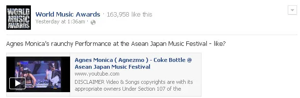 Kapanlagi.com - Penampilan Agnes Monica di Asean Japan Music Festival mendapat kritikan pedas dari World Music Awards. Mereka menilai jika perform Agnes terlalu vulgar untuk acara tersebut.
