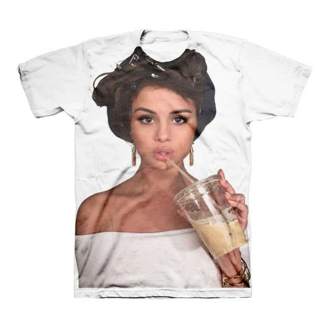 Kalau suka dengan Selena Gomez secara keseluruhan, coba miliki Curler Sublimate Tee ini. Kaos bergambar Sel sedang menikmati segelas minuman dengan sedotan ini terlalu sayang untuk dilewatkan begitu saja. Her cool face will make you look cooler.