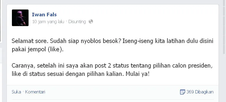 "Saya mencabut kontes status 'Like' saya pada halaman Facebook Iwan Fals. Demokrasi nggak butuh guyonan oportunistik ala Iwan Fals," tegasnya.