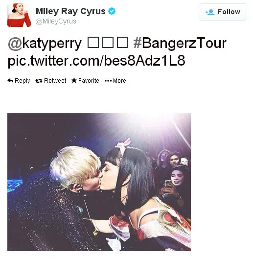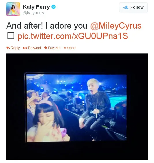 Keesokan paginya Katy Perry mengupload foto dirinya yang mengusap mulutnya usai berciuman dengan Miley. Pelantun tembang Dark Horse ini juga menuliskan I Adore You @Miley Cyrus.